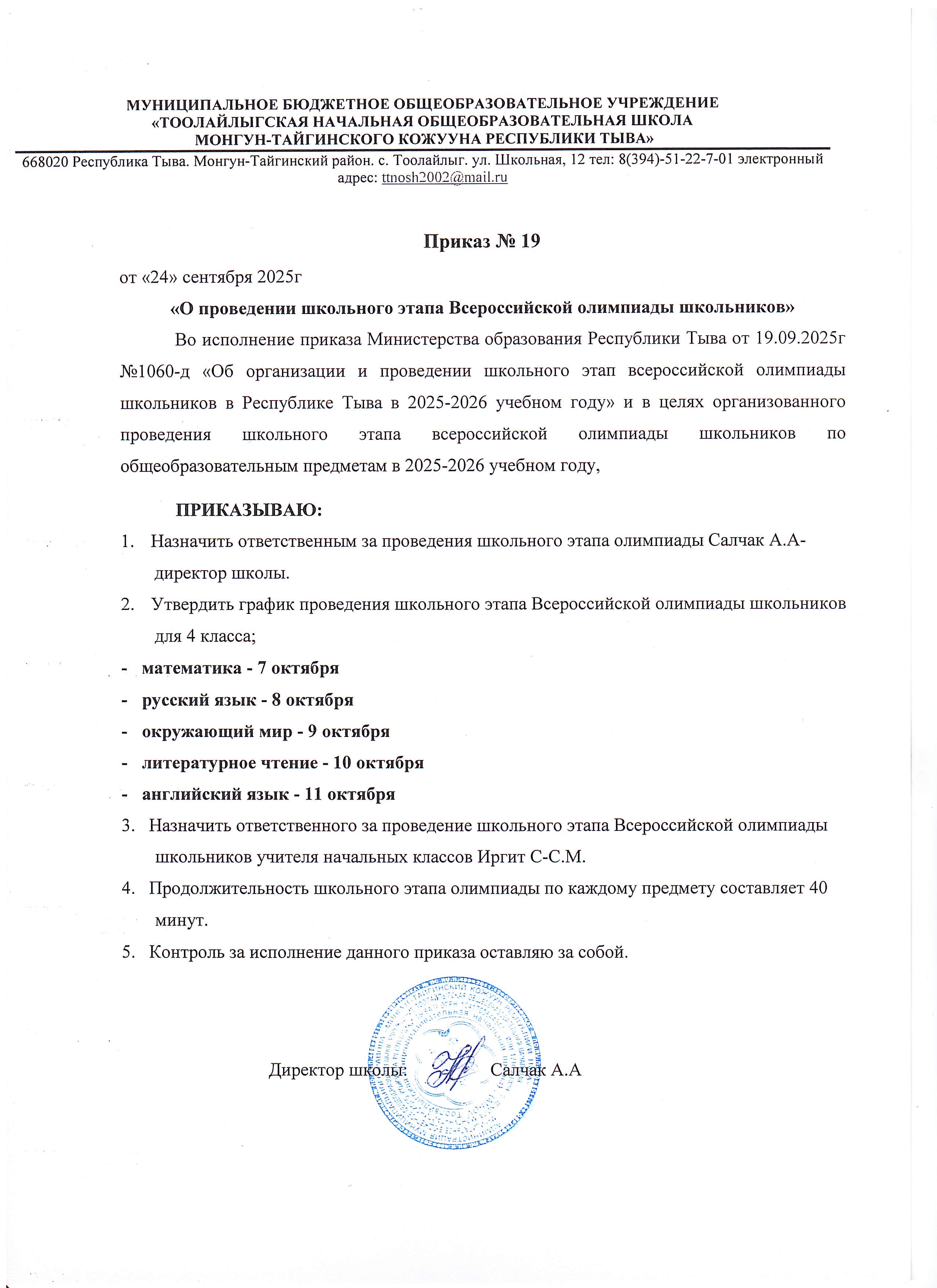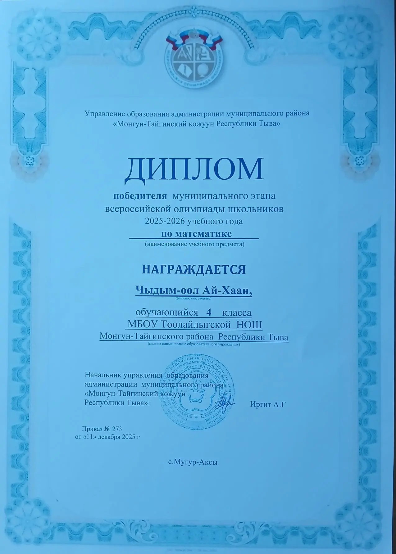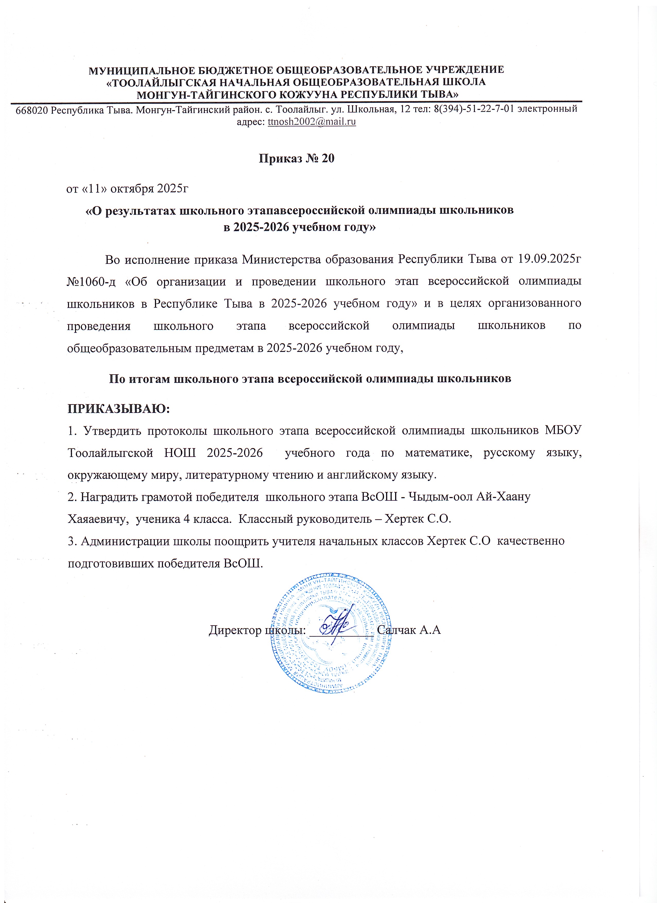 Олимпиада Приказ о проведении всероссийской олимпиады школьников в 2025-2026 учебном годуСкачать Протокол олимпиады 2025гСкачать Приказ о результатах ВсОШ в 2025-2026 учебном годуСкачать Грамота за 1 место Чыдым-оол Ай-ХаанСкачать Заявка на участие в мун.этапе ВСОШ 2025гСкачать Грамота за подготовку победителя по предмету математика в муниципальном этапе ВсОШСкачать Победитель муниципального этапа ВсОШСкачать