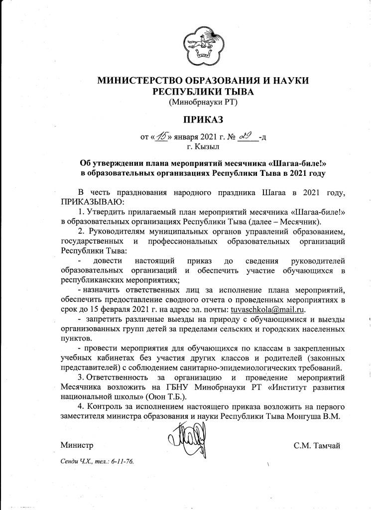 Приказ № 07 от 15 января 2021г. «Об утверждении плана мероприятий месячника «Шагаа-биле» в образовательных организациях Монгун-Тайгинского кожууна в 2021г.» Скачать