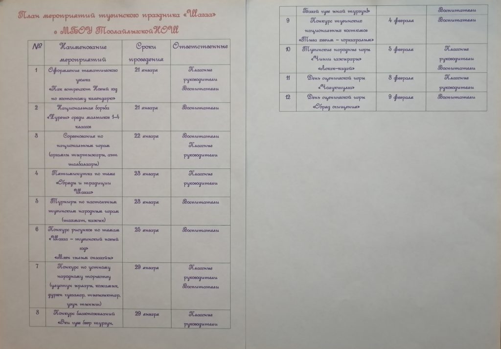 План мероприятий тувинского праздника Шагаа В МБОУ ТНОШ